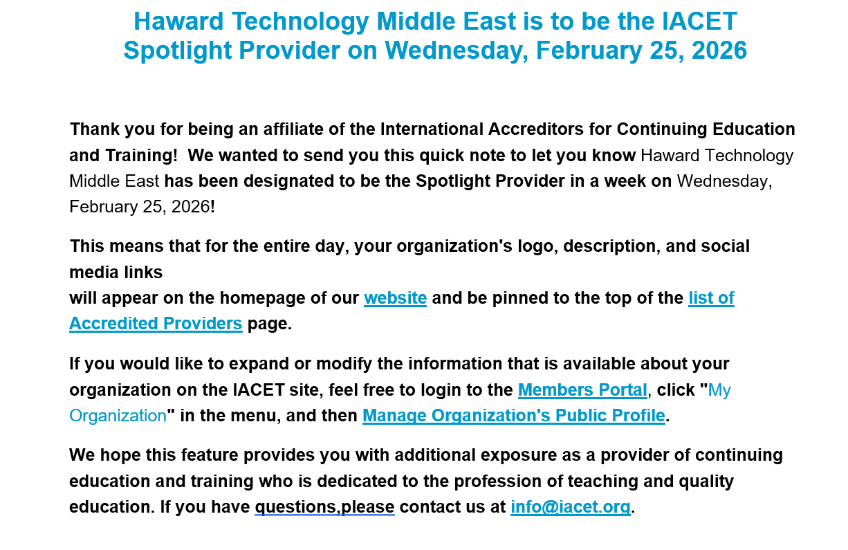Thank you for being an affiliate of the International Accreditors for Continuing Education and Training! We wanted to send you this quick note to let you know that Haward Technology Middle East has been designated as the Spotlight Provider for Friday, March 14, 2025 This means that for the entire day, your organization's logo, description, and social media links will appear on the homepage of our website and be pinned to the top of the list of Accredited Providers page. If you would like to expand or modify the information available about your organization on the IACET site, feel free to log in to the Members Portal, click "My Organization" in the menu, and then Manage Organization's Public Profile. We hope this feature provides you with additional exposure as a provider of continuing education and training dedicated to the profession of teaching and quality education. If you have any questions, please contact us at info@iacet.org.